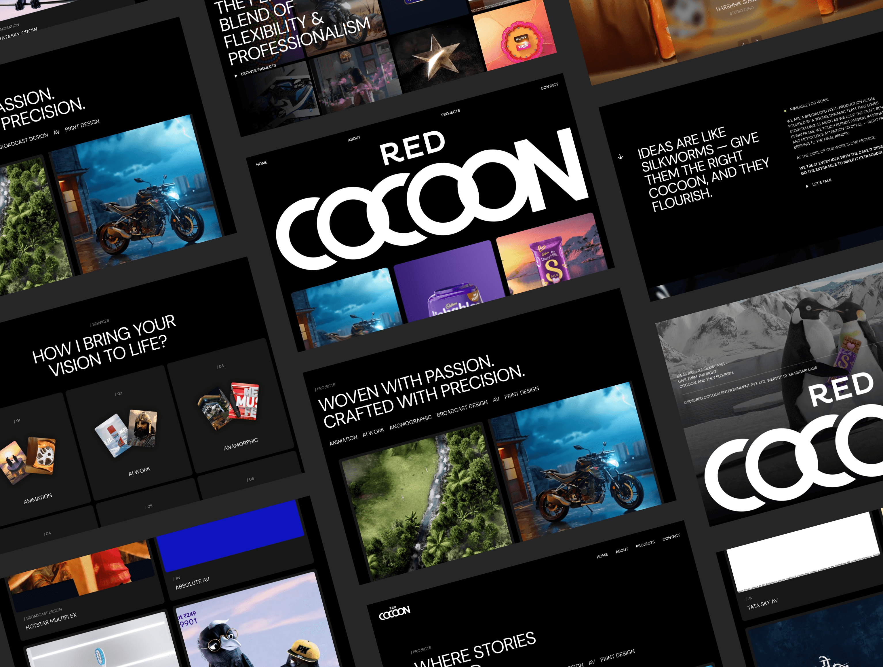 Red Cocoon is a creative post-production studio built around storytelling, craft, and visual precision. Kaarigari Labs redesigned their website to reflect the studio’s cinematic identity and creative depth through a modern, immersive digital experience. The focus was on creating a visually rich interface with smooth interactions, clean structure, and strong storytelling elements. The result is a refined and engaging website that showcases Red Cocoon’s work, process, and creative vision with clarity and impact.